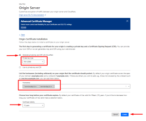 Chọn Generate private key and CSR with Cloudflare, rồi nhấn Create.