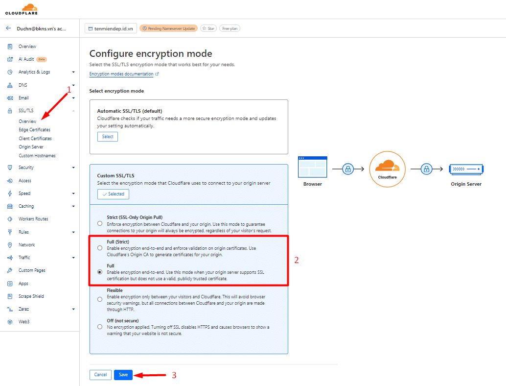 BKNS khuyến khích bạn nên sử dụng kiểu này để dữ liệu bạn gửi lên CloudFlare hoặc từ CloudFlare gửi về đều được mã hóa an toàn hơn. Bây giờ mình sẽ hướng dẫn bạn sử dụng chứng chỉ do chính CloudFlare cung cấp.