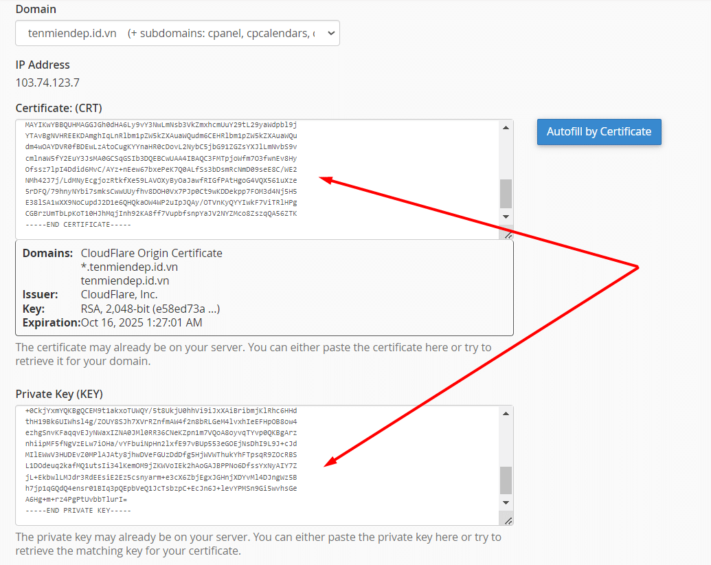 Tiếp đó tại mục Install an SSL Website, tại đây các bạn chọn đúng tên website cần cài đặt và điền các chứng chỉ Origin Certificate, Private Key ( ở Bước 2: Tạo chứng chỉ SSL).