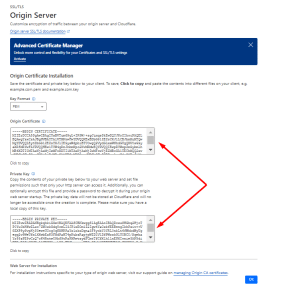 Lúc này CloudFlare sẽ cung cấp cho bạn 2 nội dung Origin Certificate và Private Key. Bạn tiến hành copy và lưu lại nội dung 2 File này (quan trọng), sau khi đã lưu xong bạn chọn OK.