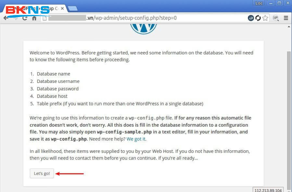Sau khi hoàn thành các bước tạo database, tao user, add user sử dụng database xong, quý khách tiến hành truy cập tên miền của quý khách bằng trình duyệt web để cài đặt Website Wordpress.