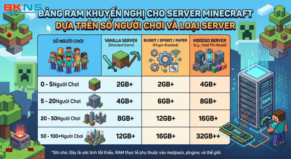 | Số người chơi | Loại server | RAM khuyến nghị |