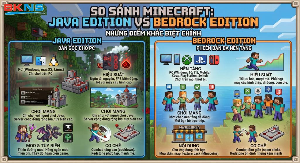 Chọn giữa Minecraft Java Edition và Minecraft Bedrock Edition là bước quan trọng khi thiết lập hosting minecraft. Nhiều người bỏ qua hoặc chọn theo cảm tính, nhưng đây lại là nguyên nhân khiến server không chạy đúng nhu cầu, thậm chí phải làm lại từ đầu. Mỗi phiên bản phục vụ một mục đích khác nhau, và nếu chọn đúng ngay từ đầu, bạn sẽ tiết kiệm rất nhiều thời gian.