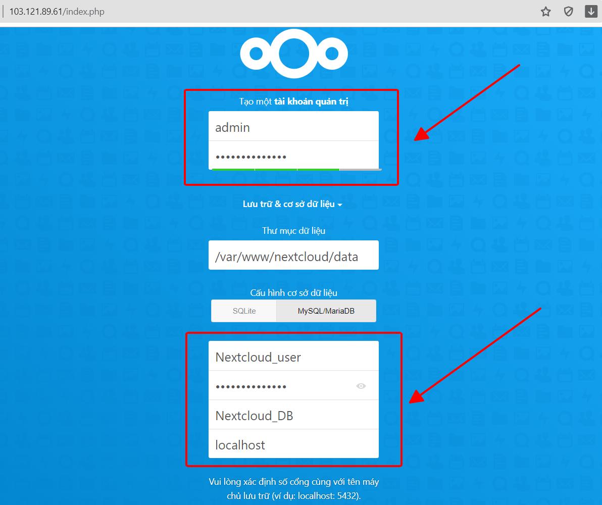 Sau đó truy cập vào domain hoặc IP của bạn để cấu hình tài khoản admin và database cho Nextcloud, sử dụng các thông tin mà bạn đã tạo ở bước cấu hình Mysql