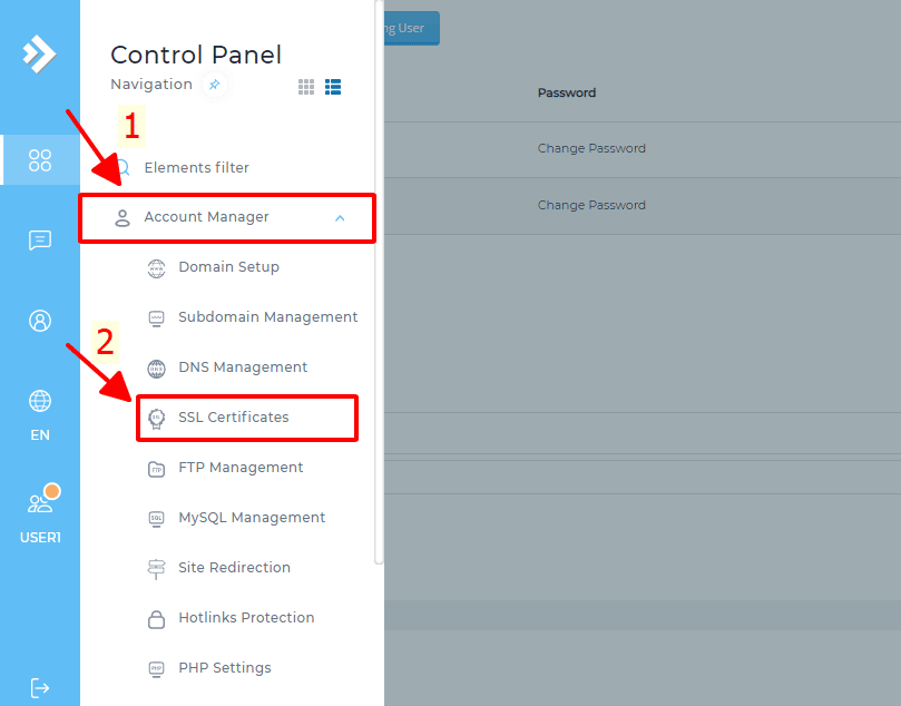Bước 2: từ thanh công cụ bên trái các bạn chọn Account Manager -> SSL Certificates