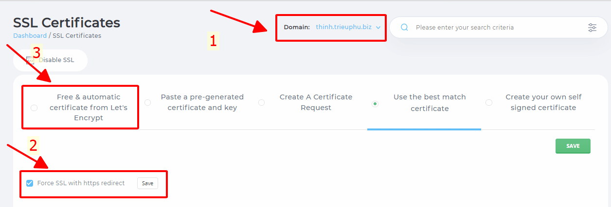 Bước 3: Lựa chọn domain để cài SSL ở số 1, tiếp theo các bạn tích vào Force SSL with https redirect rồi nhấn save để web tự chuyển thành https, cuối cùng tích vào Free & automatic certificate from Let’s Encrypt để cài SSL miễn phí