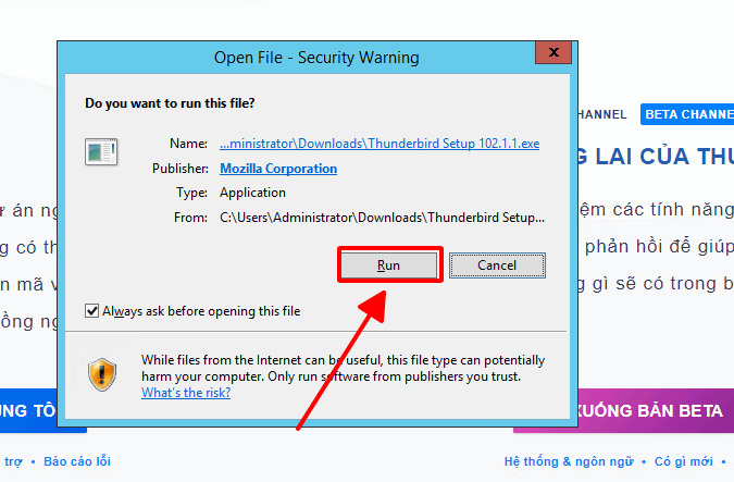 Bước 2: Chọn run để bắt đầu cài đặt