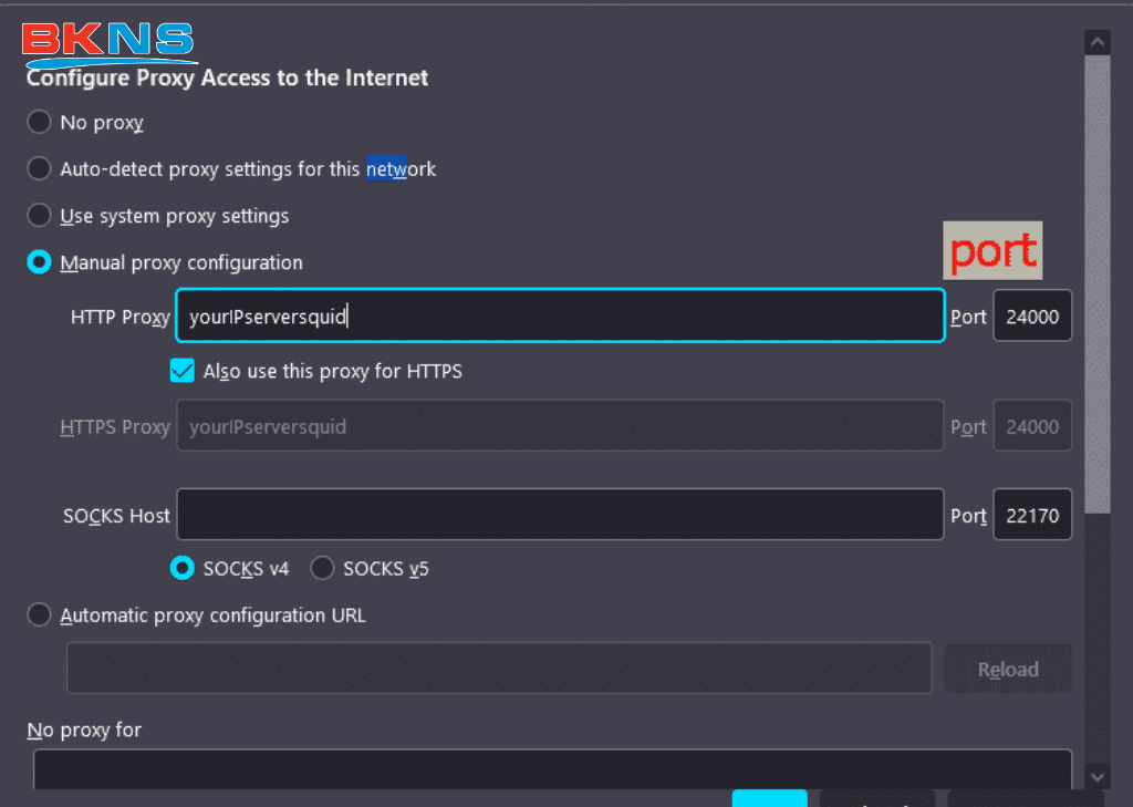 – Nhập địa chỉ IP máy chủ Squid của bạn vào trường HTTP Host và 24000 trong trường Port.