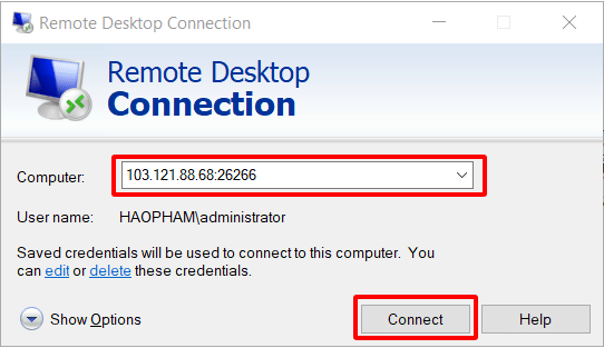 Bước 1: Kết nối Remote đến máy chủ Windows.
