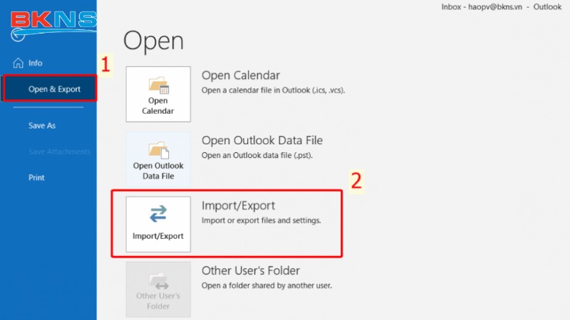 Bước 1:Open Outlook -> Chọn File -> Open & Export -> Import/Export.