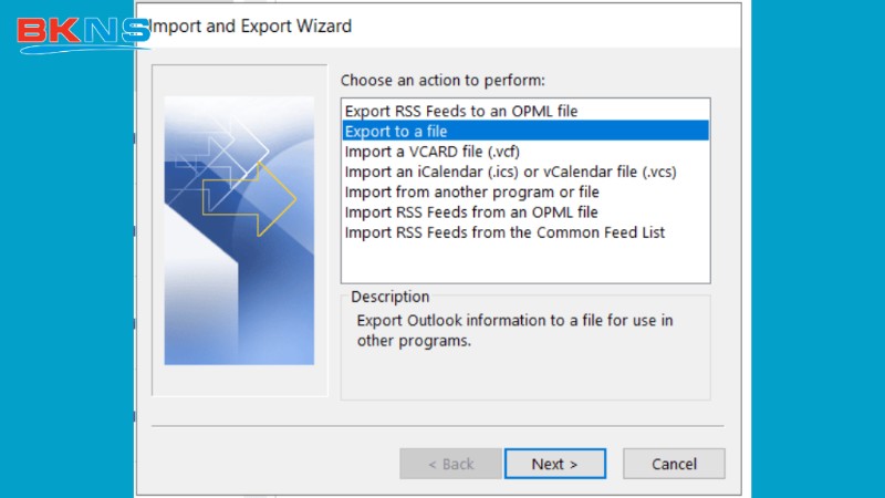Bước 2: Chọn định dạng file Export to a file sau đó bấm Next