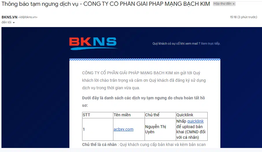 Sau 15 ngày kể từ ngày nhận được email thông báo cập nhật hồ sơ tên miền thì BKNS sẽ tạm ngưng hoạt động của tên miền trong vòng 30 ngày, chờ quý khách cập nhật hồ sơ và có thông báo bằng email tới quý khách. Email như dưới đây: