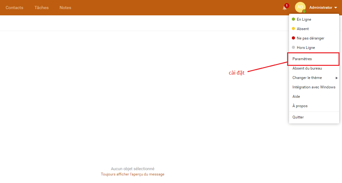 Sau khi đăng nhập xong, click chuột vào mục User ở góc phải giao diện và chọn Paramètres (Cài đặt) như hình: