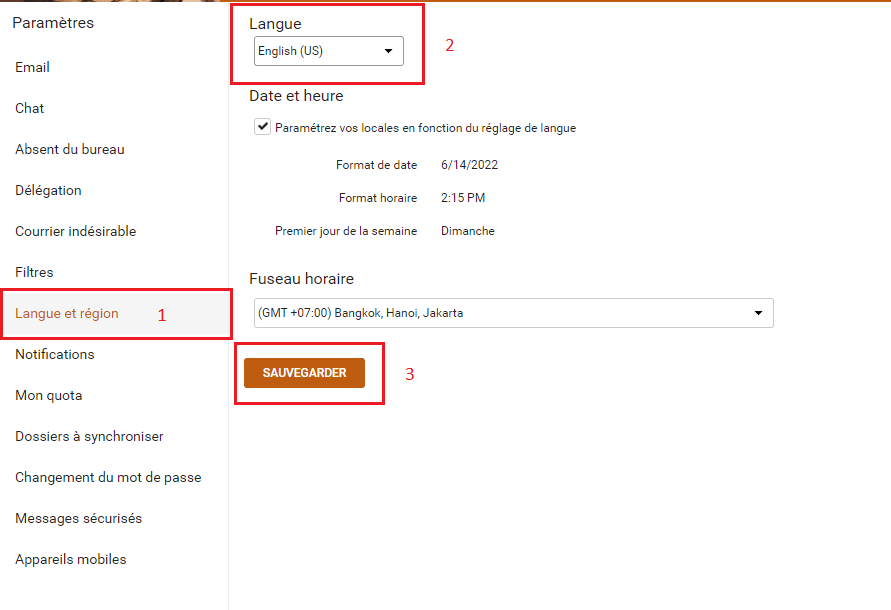 Chọn Langue et région (1) , chuyển về ngôn ngữ English (US) (2) như hình và bấm Sauvegader (3)