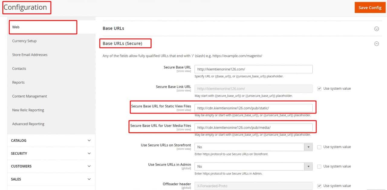 Chuyển tiếp các mục Stores -> Configuration -> General -> Web -> Base URLs và cập nhật đường dẫn CDN.