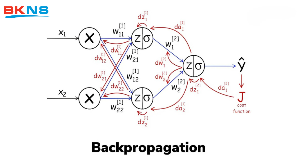 Backpropagation (lan truyền ngược) là một kỹ thuật quan trọng trong mạng nơ-ron. Nó cho phép tính toán gradient ngược từ layer cuối cùng đến layer đầu tiên của mạng. Quá trình này bắt đầu bằng việc mạng phân tích các tham số và điều chỉnh chúng thông qua hàm mất mát. Sau đó, giá trị lỗi được tính toán sẽ được lan truyền ngược lại để điều chỉnh các tham số một cách phù hợp.