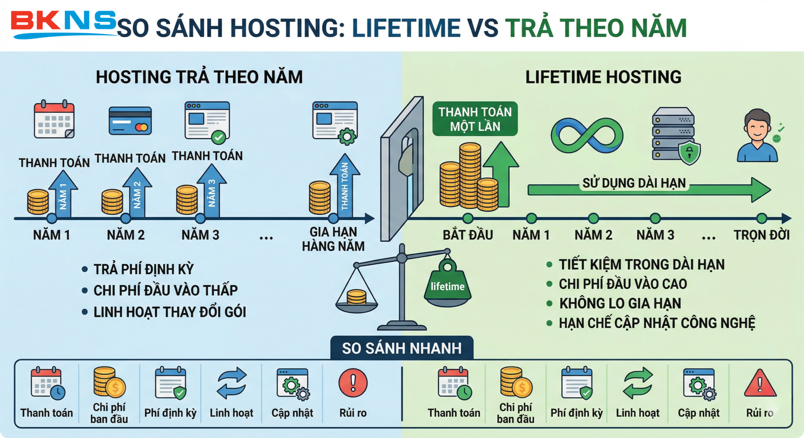 | Lifetime Hosting | Trả 1 lần | Thấp – trung bình | Rất thấp | Gần như không | Website ổn định, ít thay đổi | Bị giới hạn tài nguyên |