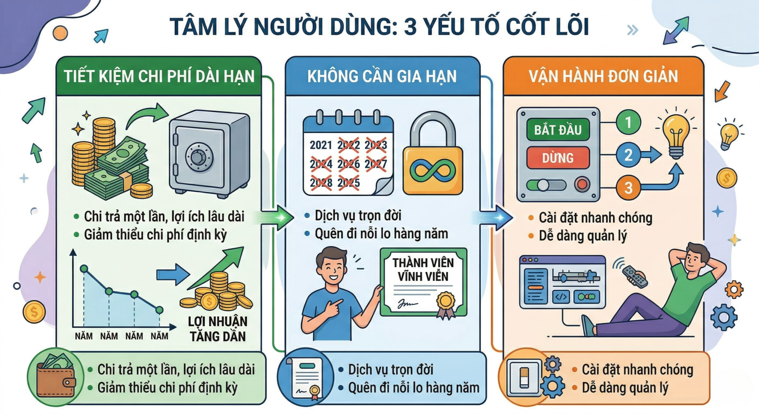 - Đơn giản hóa vận hành – đúng tâm lý “mua một lần, dùng mãi”: Không phải ai cũng muốn quản lý hosting, theo dõi gói dịch vụ hay tối ưu hệ thống. Phần lớn chỉ cần một website chạy ổn định, không cần can thiệp nhiều. Lifetime hosting đáp ứng đúng nhu cầu đó: không phải so sánh gói mỗi năm, không cần nâng cấp liên tục, không phải xử lý nhiều hóa đơn. Tất cả được gom lại thành một hành động duy nhất: mua một lần và sử dụng lâu dài.