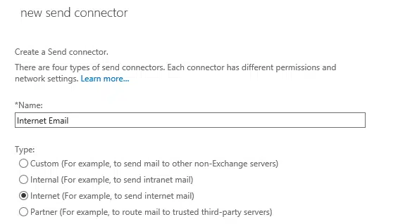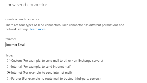 Đặt tên send connectors với tên gợi ý dễ nhớ đại loại như Internet Email
