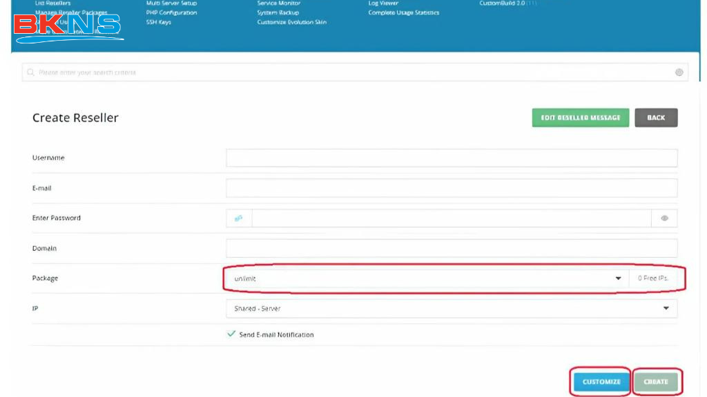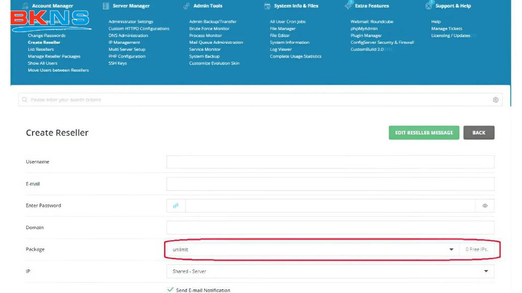 Chọn Manage Reseller Packages > Create