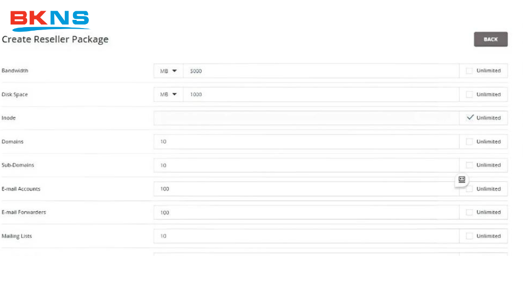 Tài nguyên được phân cho tài khoản Reseller phụ thuộc các thông số setup tại các mục trên hình