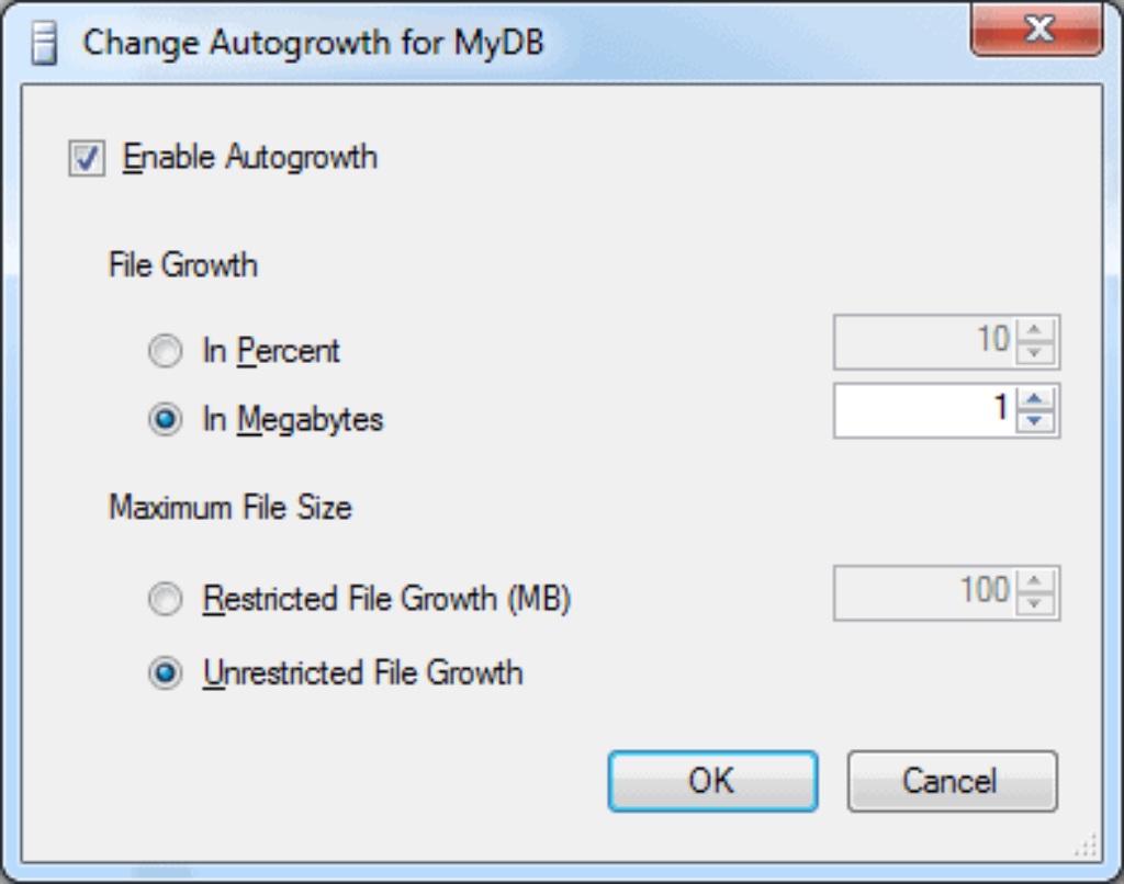 - Đặt File Growth theo Megabytes (ví dụ: 256MB hoặc 512MB) thay vì theo %