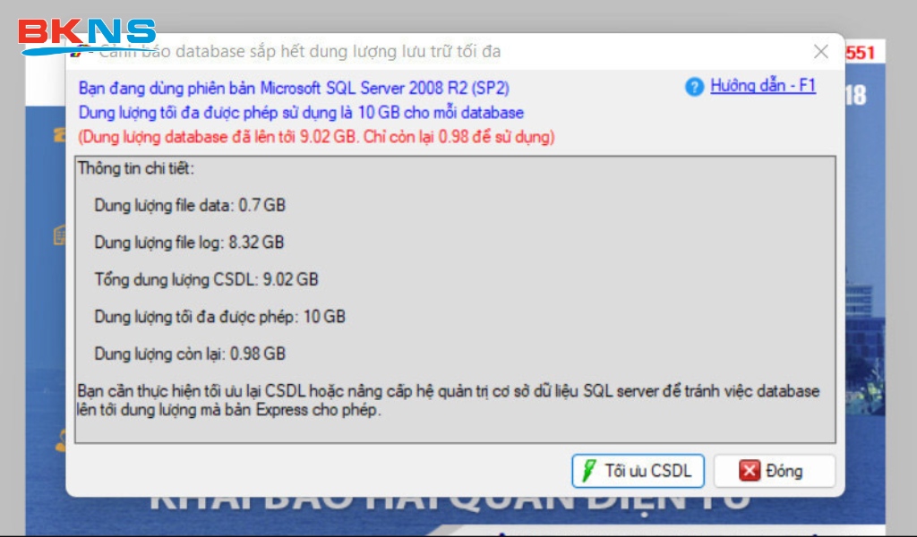 - “Database size exceeds the limit of 10240 MB for SQL Server Express Edition” thường xuất hiện trong phần mềm ECUS5-VNACCS