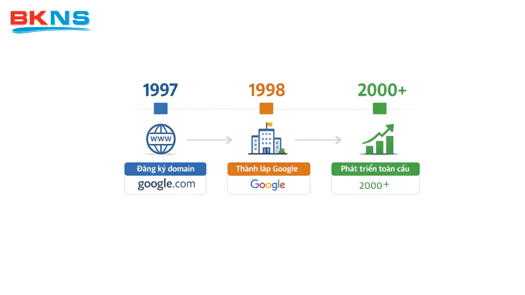 - 15/09/1997 (Ngày đăng ký tên miền): Đây là thời điểm tên miền google.com chính thức được mua và đăng ký thành công trên hệ thống Internet. Cần lưu ý, lúc này Google chỉ là một tên miền, chưa hề có thực thể công ty nào tồn tại.