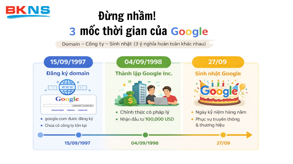 Hiểu đúng ba mốc thời gian này giúp bạn không còn nhầm lẫn khi tìm hiểu về Google: 1997 là năm đăng ký tên miền google.com, 1998 là năm công ty chính thức ra đời, còn 27/09 là ngày sinh nhật được Google lựa chọn để kỷ niệm hàng năm. Mỗi mốc mang một ý nghĩa riêng: domain là bước khởi đầu trên Internet, pháp lý là nền tảng doanh nghiệp, còn sinh nhật là yếu tố truyền thông và thương hiệu.
