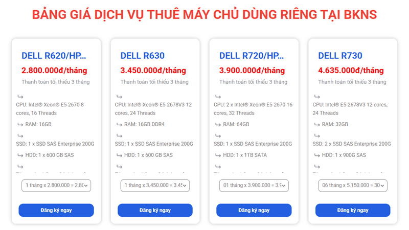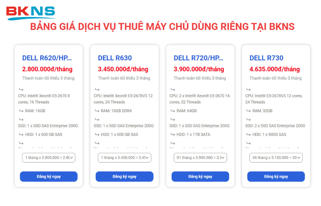 Để nắm rõ bảng giá chi tiết và các cấu hình thuê server vật lý đang được BKNS cung cấp, quý khách có thể tham khảo trực tiếp tại đây: https://www.bkns.vn/server/thue-may-chu-dung-rieng.html